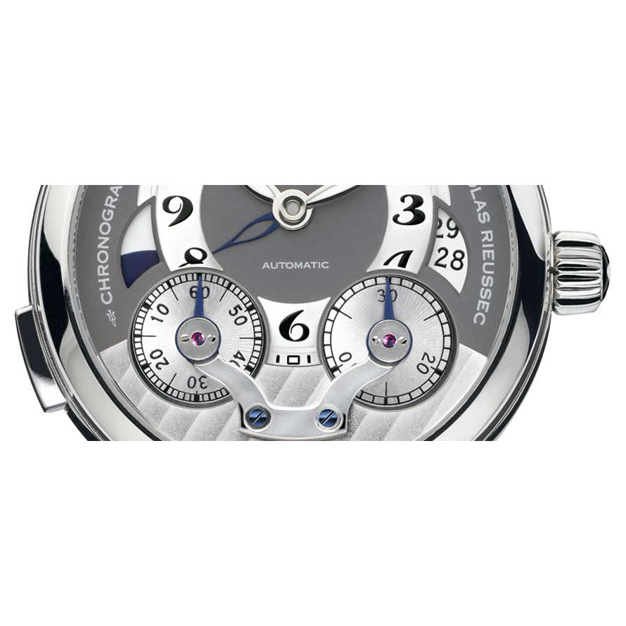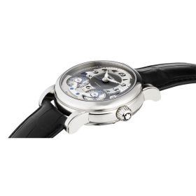 43 mm watch with stainless steel case, Montblanc Calibre MB R200, monopusher chronograph with automatic winding, anthracite-coloured dial with applique hour circle, date display, second time zone with day/night display, chronograph counters with rotating discs.